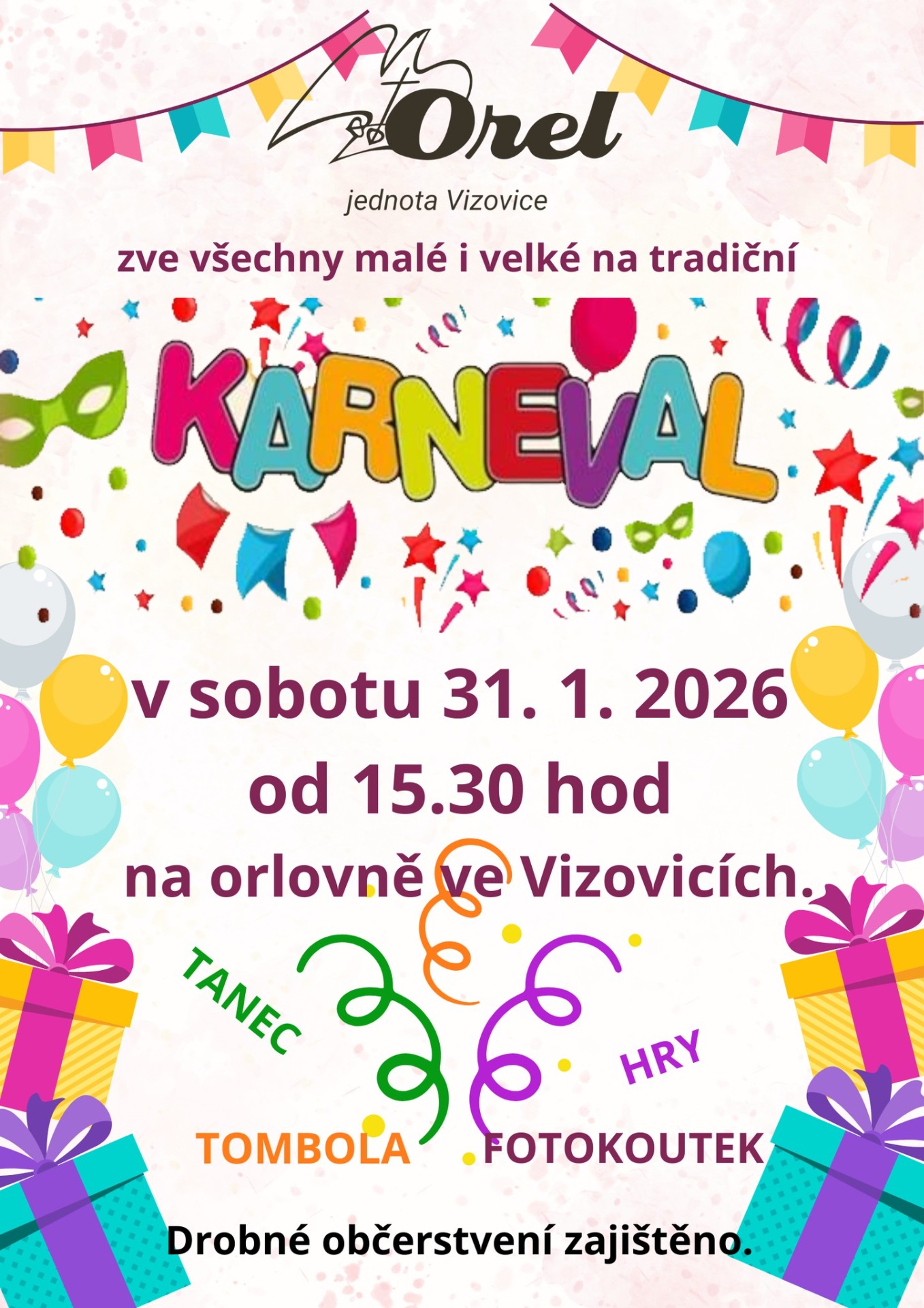 Srdečně zveme všechny děti, rodiče i prarodiče na tradiční karneval na orlovně: