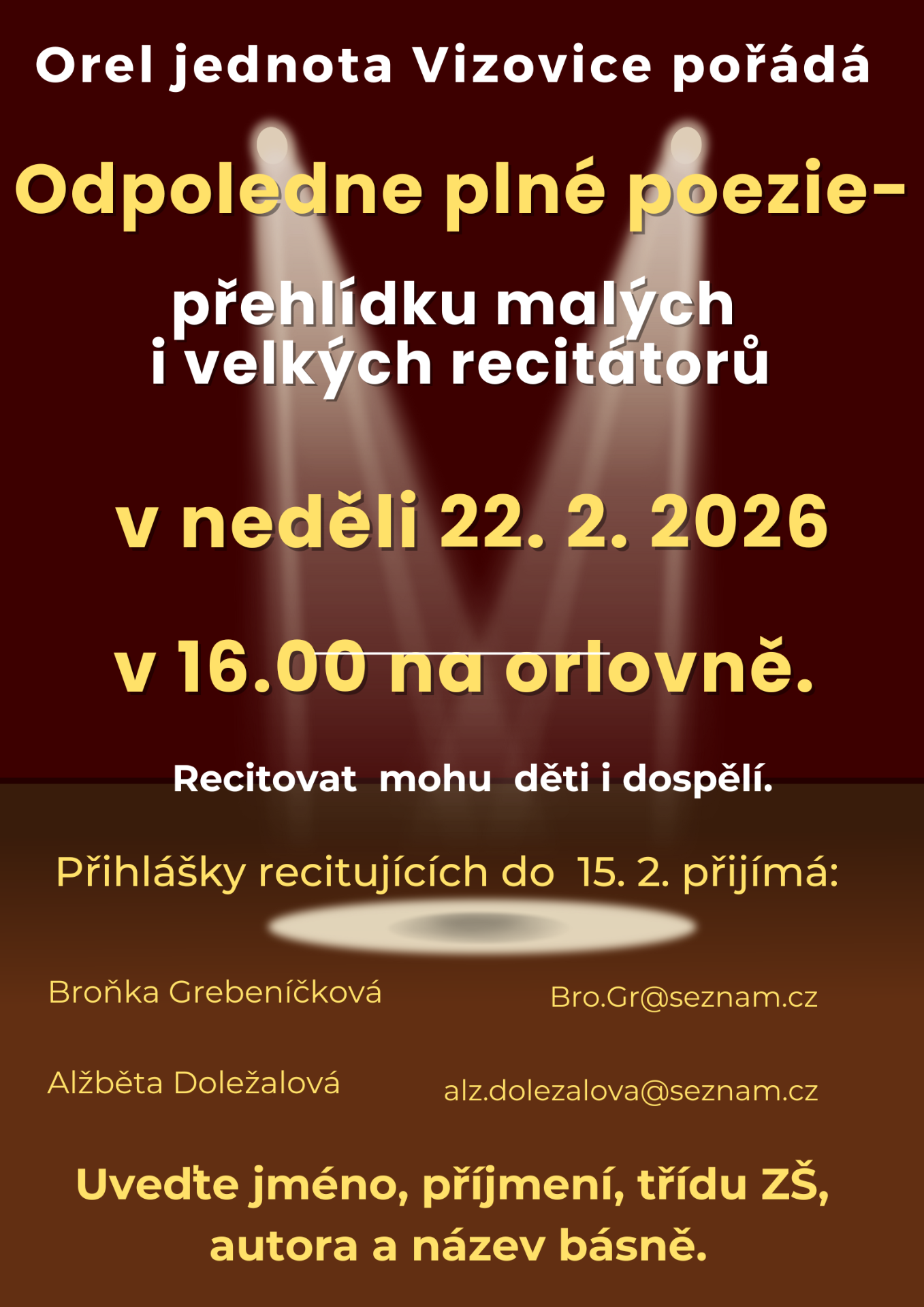 Srdečně zveme všechny milovníky poezie na další ročník Odpoledne plného poezie, který se uskuteční v sobotu 22. 2. 2026.